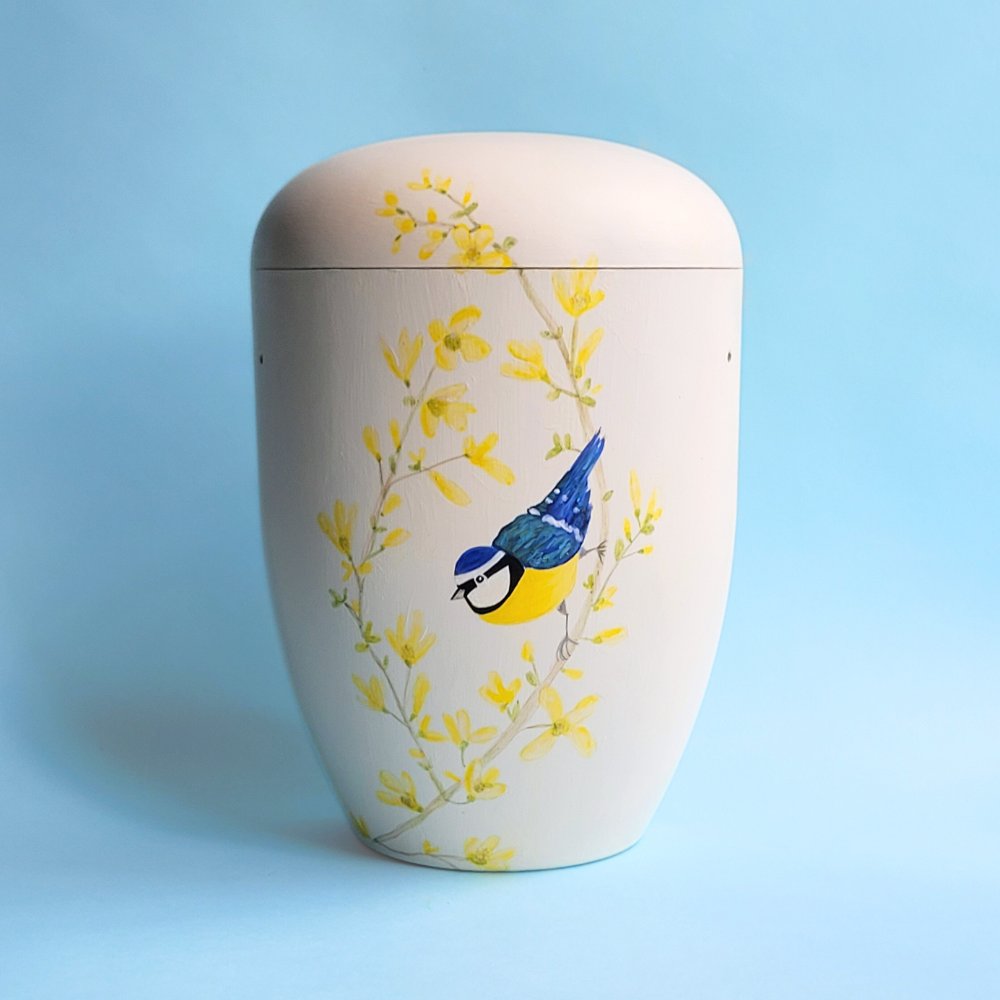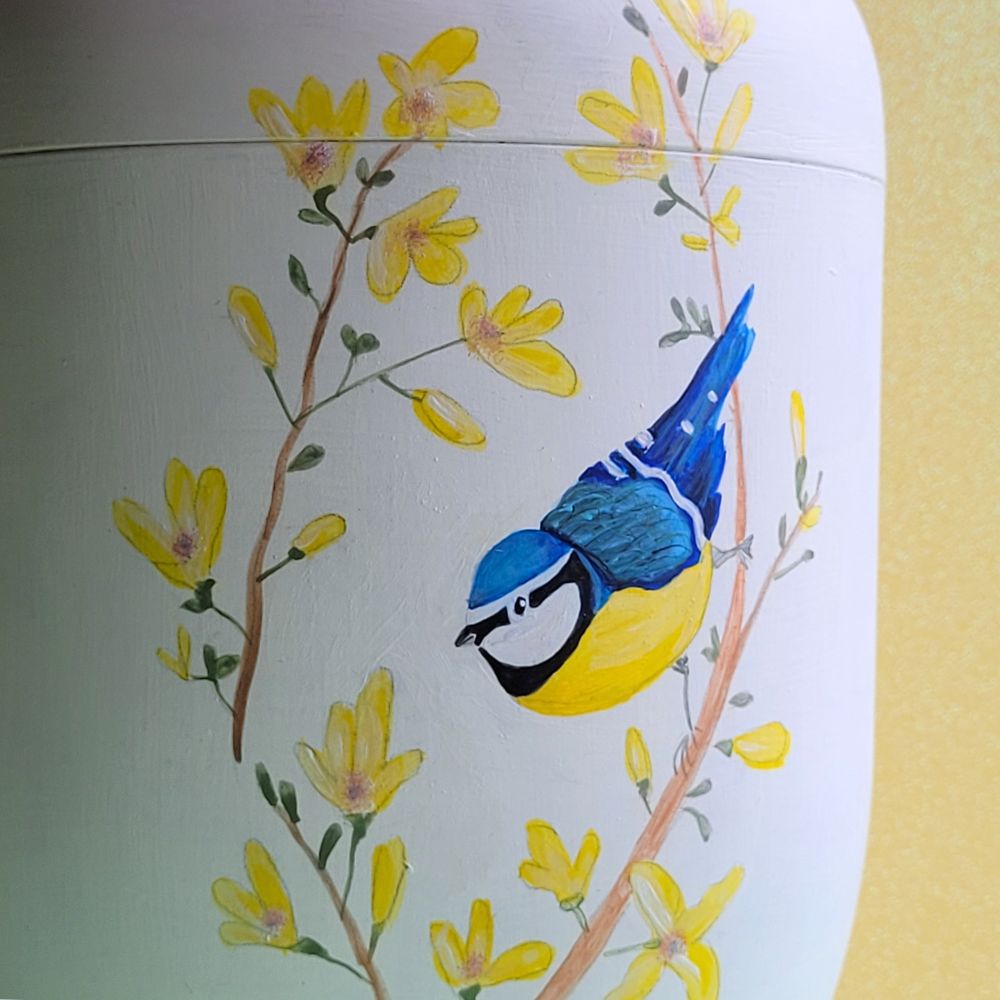 Die Urne ist in einem warmen Weißton grundiert. Der gelb blühende Goldflieder ist zart und leicht gemalt – die in den Zweigen sitzende, kleine Blaumeise hingegen in etwas kräftigeren Farben.