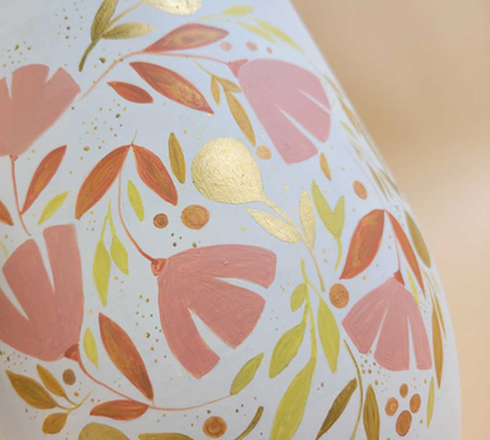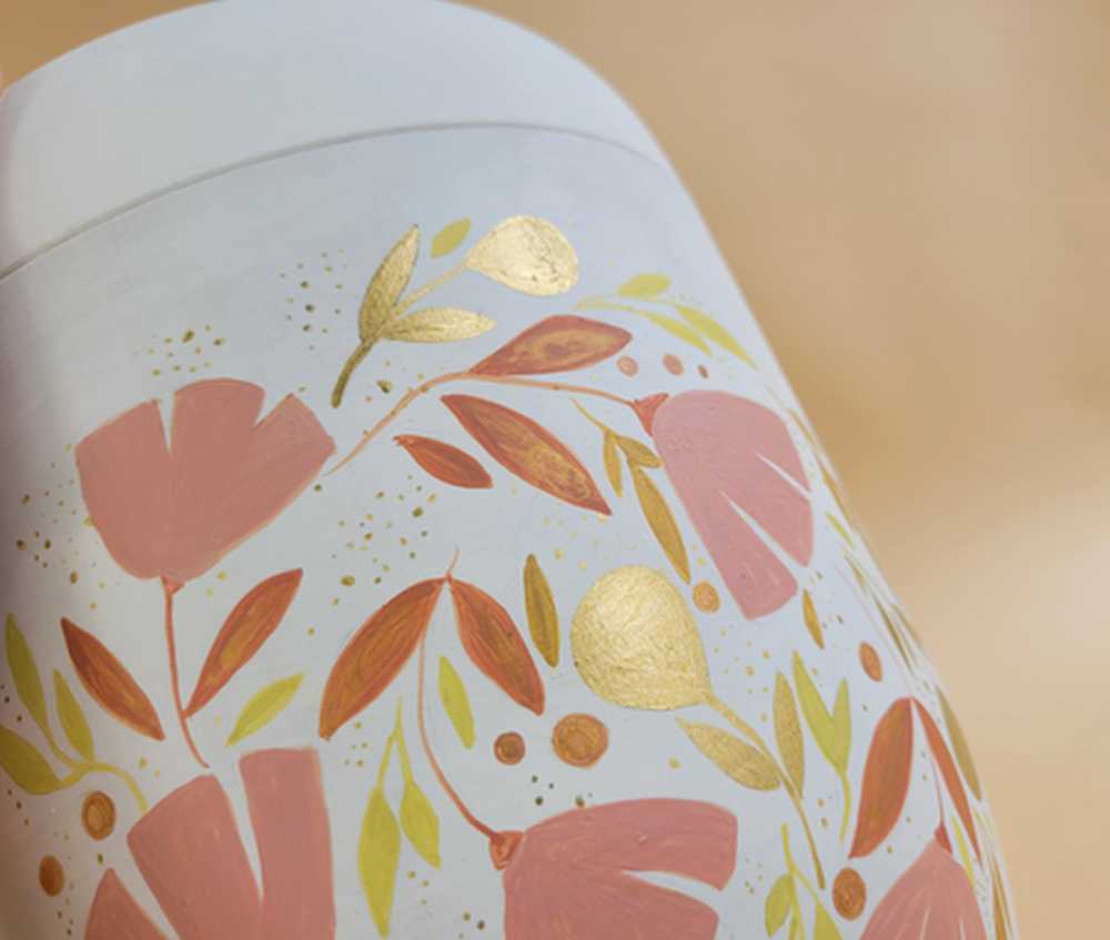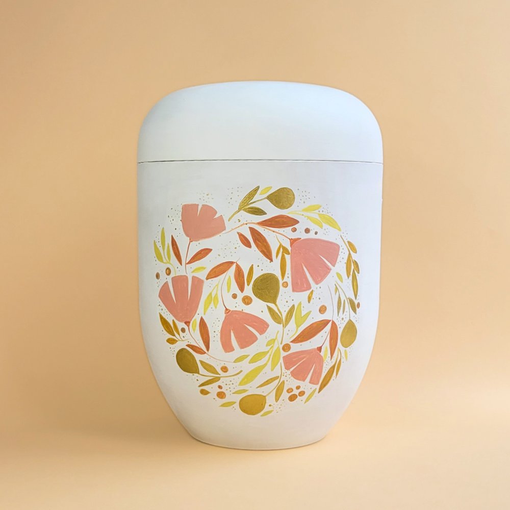 Die Urne ist in einem warmen Weißton grundiert, und erdigen Farben bemalt. Die goldenen Blüten und kupferfarbenen Elemente den Blumenmotivs schimmern, wenn die Sonne darauf fällt. Durch die kreisförmige Anordnung der Blätter und Blüten lässt das Design an einen geschlossenen Lebenszyklus denken.