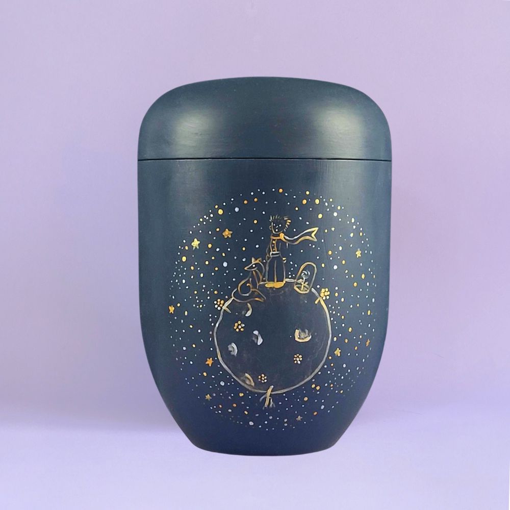 Der Kleine Prinz ist einem warmen Mitternachts-Blau-Grau grundiert. Prinz, Fuchs & Rose sind in Gold- und Silbertönen gemalt. Die Farben verändern sich – glänzen und funkeln, sobald Licht darauf fällt oder die Urne bewegt wird.